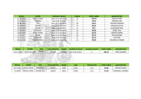 datum lovišče kraj vrsta odvzema divjad spol Telesna teža točke trofeje uplenitelj član